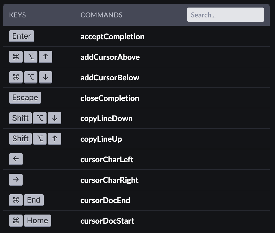 I’d love to show users available shortcuts in CodeMirror, particularly based on whatever extensions are active.