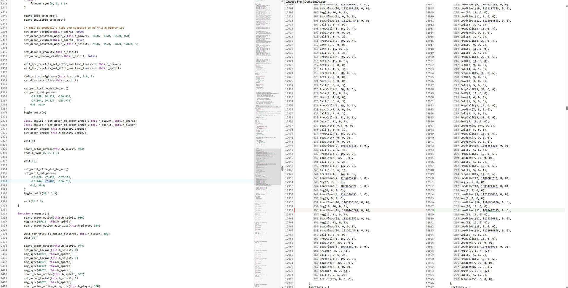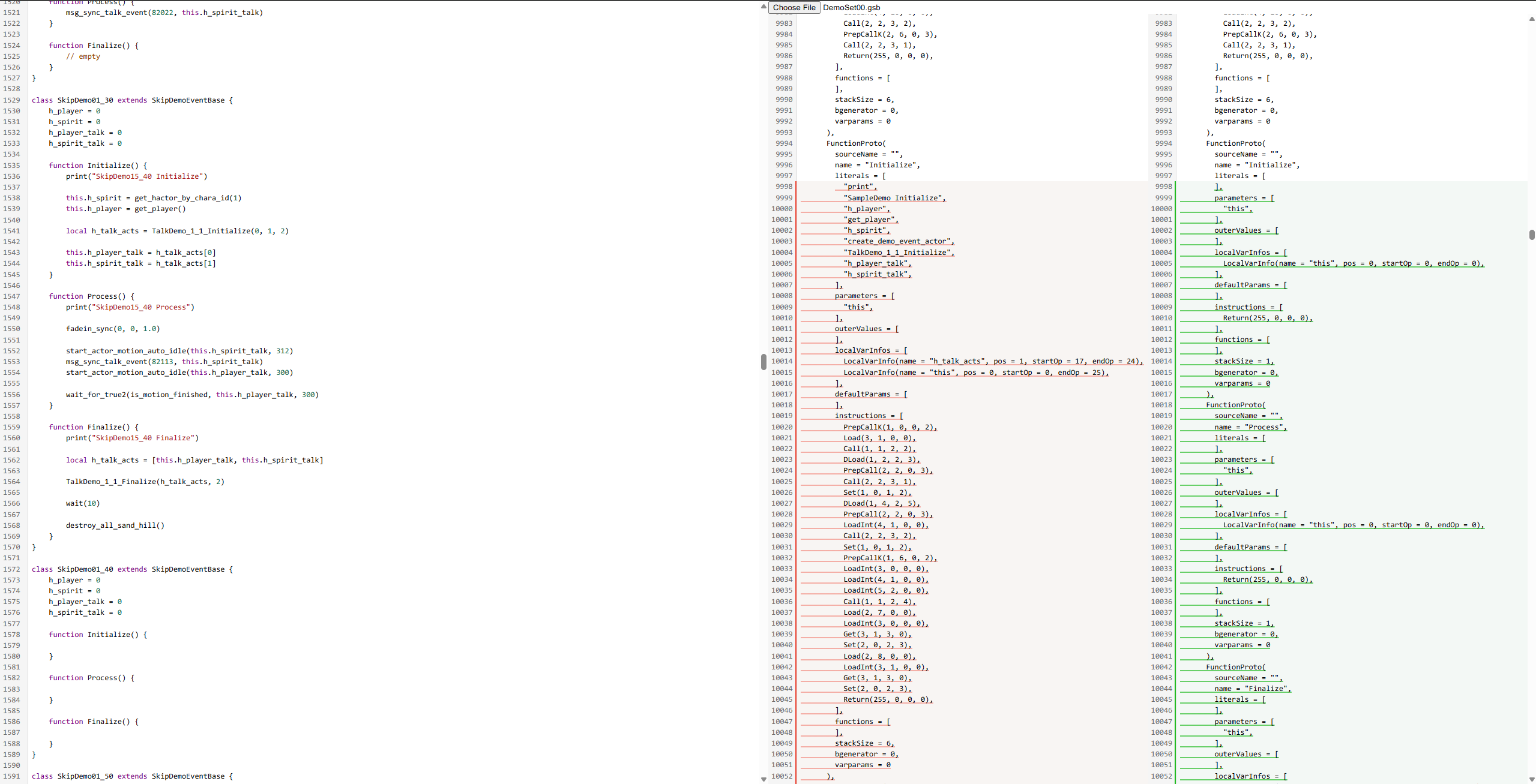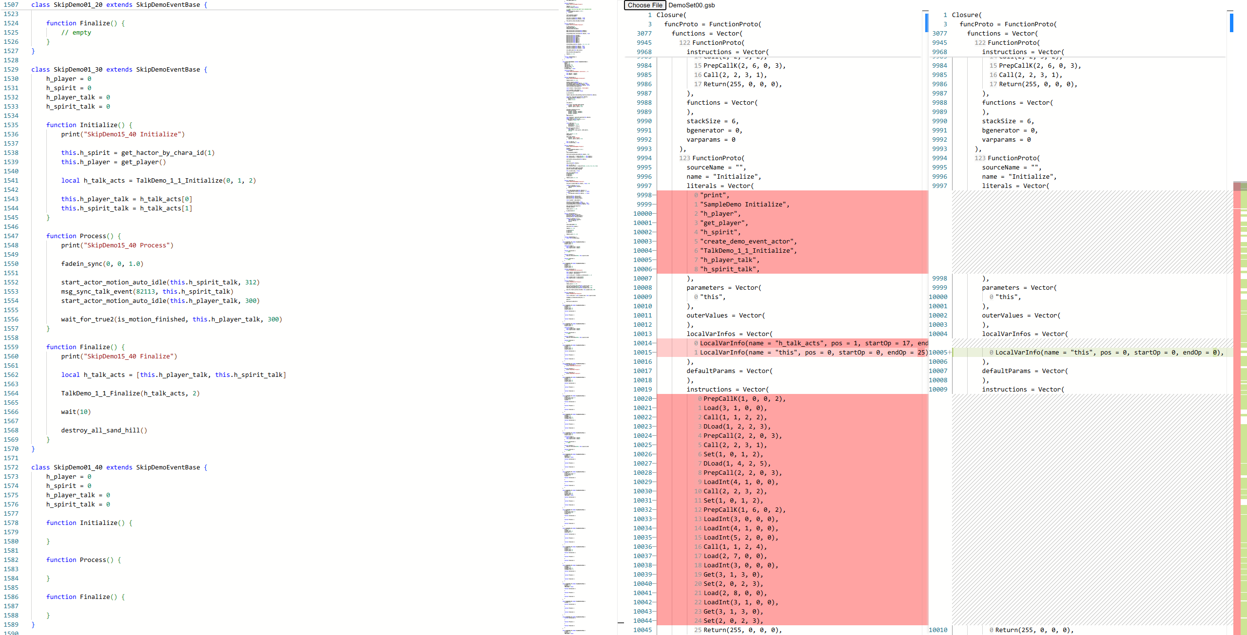 Beyond the nice hatch pattern for added/removed lines, and the diff minimap showing where along the files the changes are, which are just cosmetic niceities, it’s pretty important to my workflow to be able to line up instructions side-by-side. Especially to see i.e. LoadInt(1, 2, 0, 0) on line 3 be matched up with LoadInt(2, 2, 0, 0) on line 4, telling me I’m both missing an instruction and have my stack set up wrong.