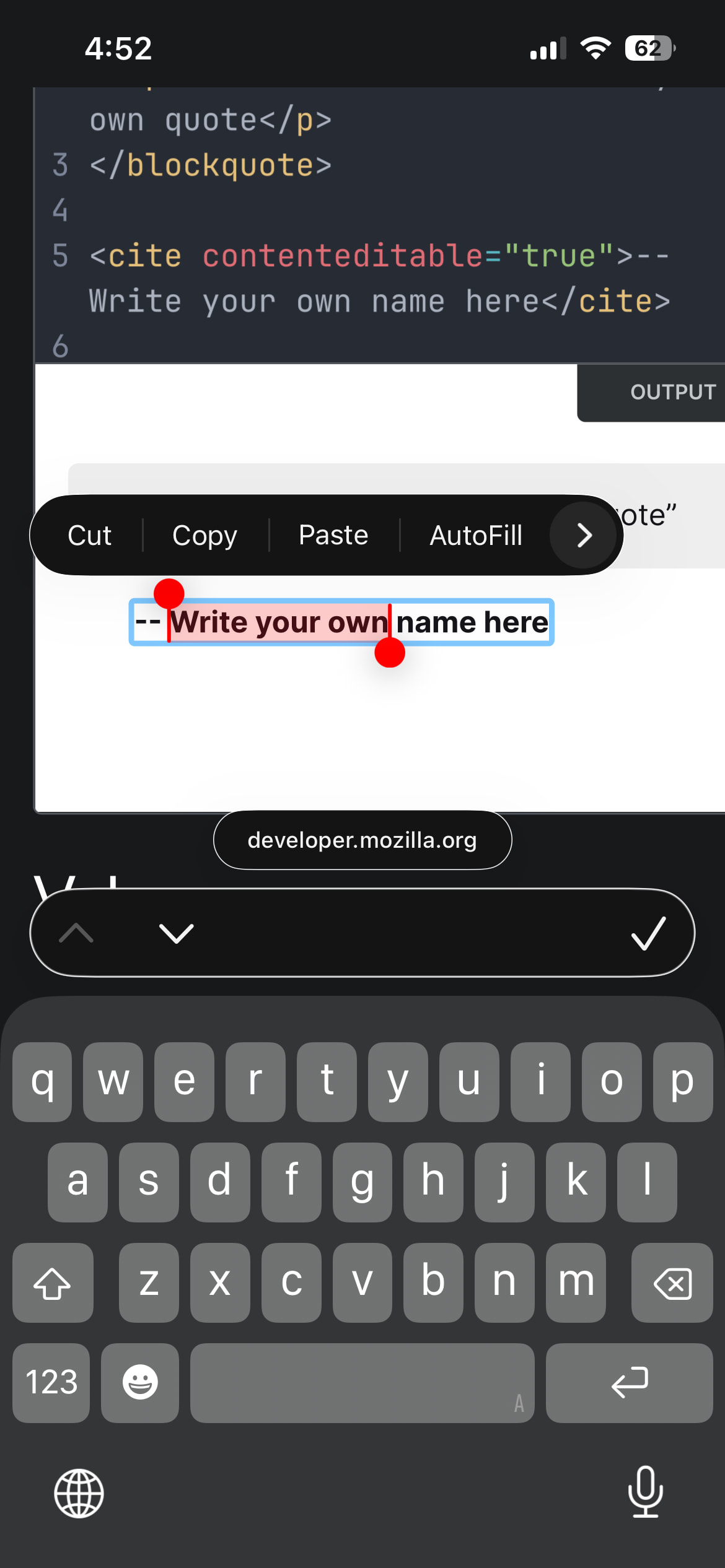 CodeMirror 6 instances are missing the standard selection drag handles in iOS. I’m not sure why. I’ve replicated this on Try CodeMirror and in other CM6 instances.