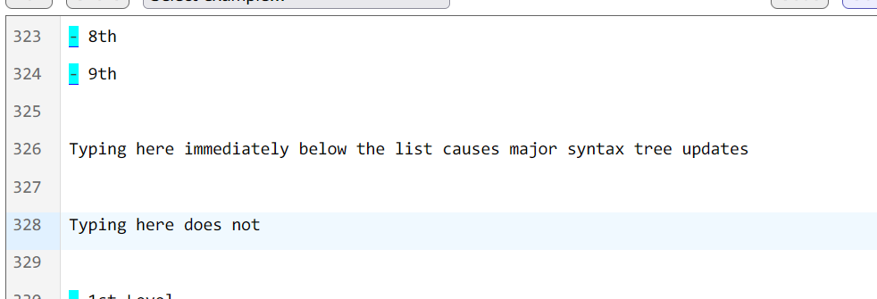 Yeah sorry about that! Hope the info below is clearer. Screenshots taken from the codemirror try website. The gist is editing the immediate succeeding paragraph after a list seem to cause a major syntax tree update, but editing paragraphs after that (or the list item themselves) don’t.